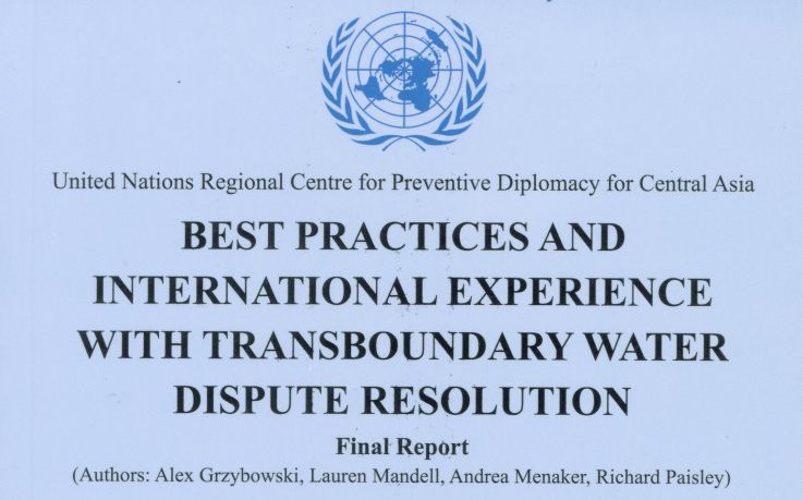 This report documents the results of an applied research and capacity building initiative undertaken by the United Nations Regional Center for Preventive Diplomacy for Central Asia in the fall of 2010. The research team included Andrea Menaker and Lauren Mandell whose time was generously donated by the international law firm of White and Case, Richard Paisley from the University of British Columbia and Alex Grzybowski from the UNDPA Mediation Support Unit, Mediation Standby Team. The initiative focused on the international best practices for trans-boundary water dispute resolution. These practices were presented to representatives of Kazakhstan, Kyrgyzstan, Tajikistan, and Turkmenistan, as well as numerous international agencies in an experiential learning workshop held in December 2010 in Almaty, Kazakhstan.