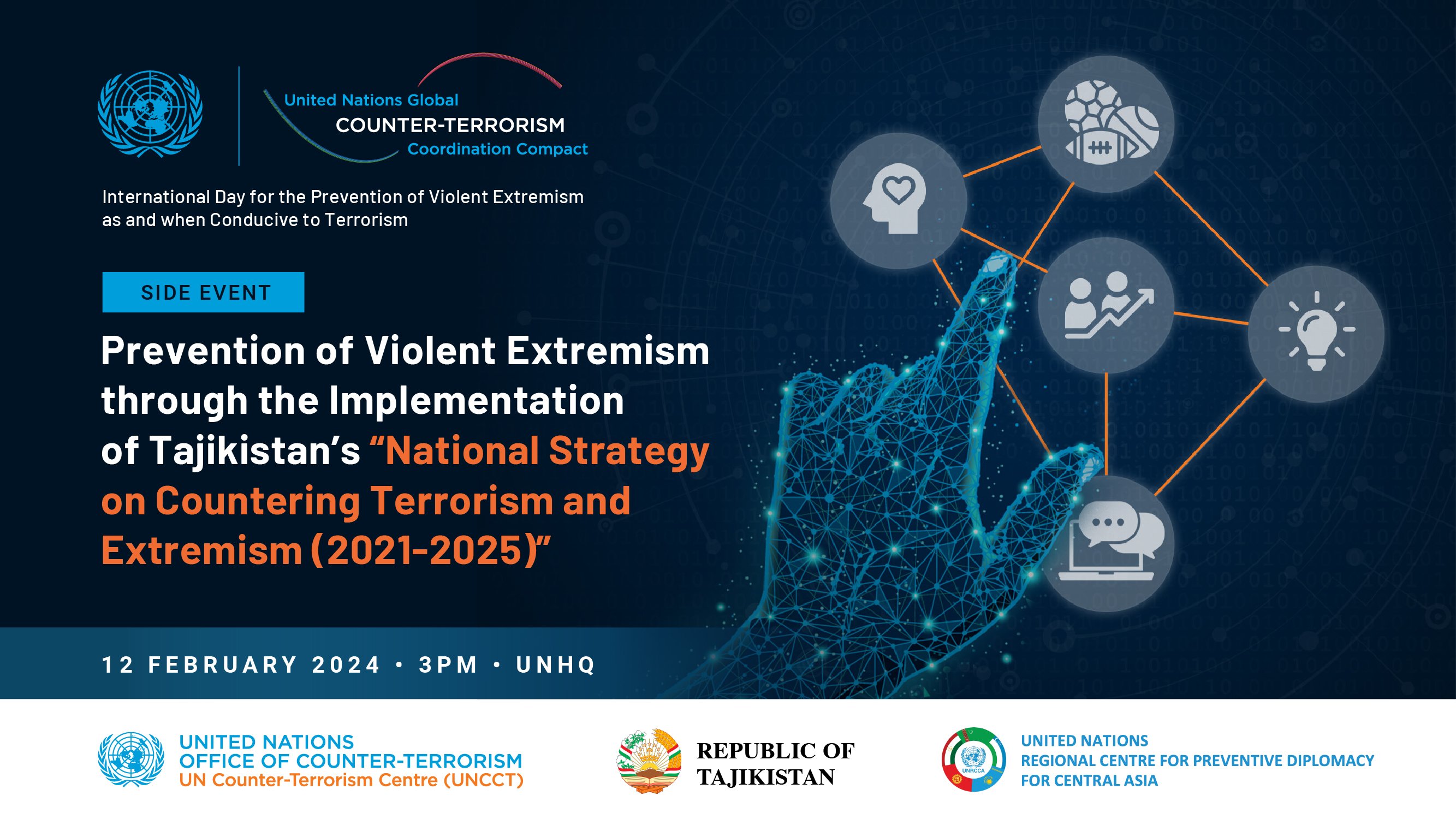 12 февраля 2025 года РЦПДЦА, в партнерстве с Контртеррористическим управлением ООН (UNOCT) и Правительством Республики Таджикистан, организовали параллельное мероприятие на тему «Предотвращение насильственного экстремизма посредством реализации Национальной стратегии Республики Таджикистан по противодействию экстремизму и терроризму на 2021-2025 годы». Мероприятие прошло в Штаб-квартире ООН в Нью-Йорке и было приурочено к Международному дню борьбы с насильственным экстремизмом, способствующим терроризму.