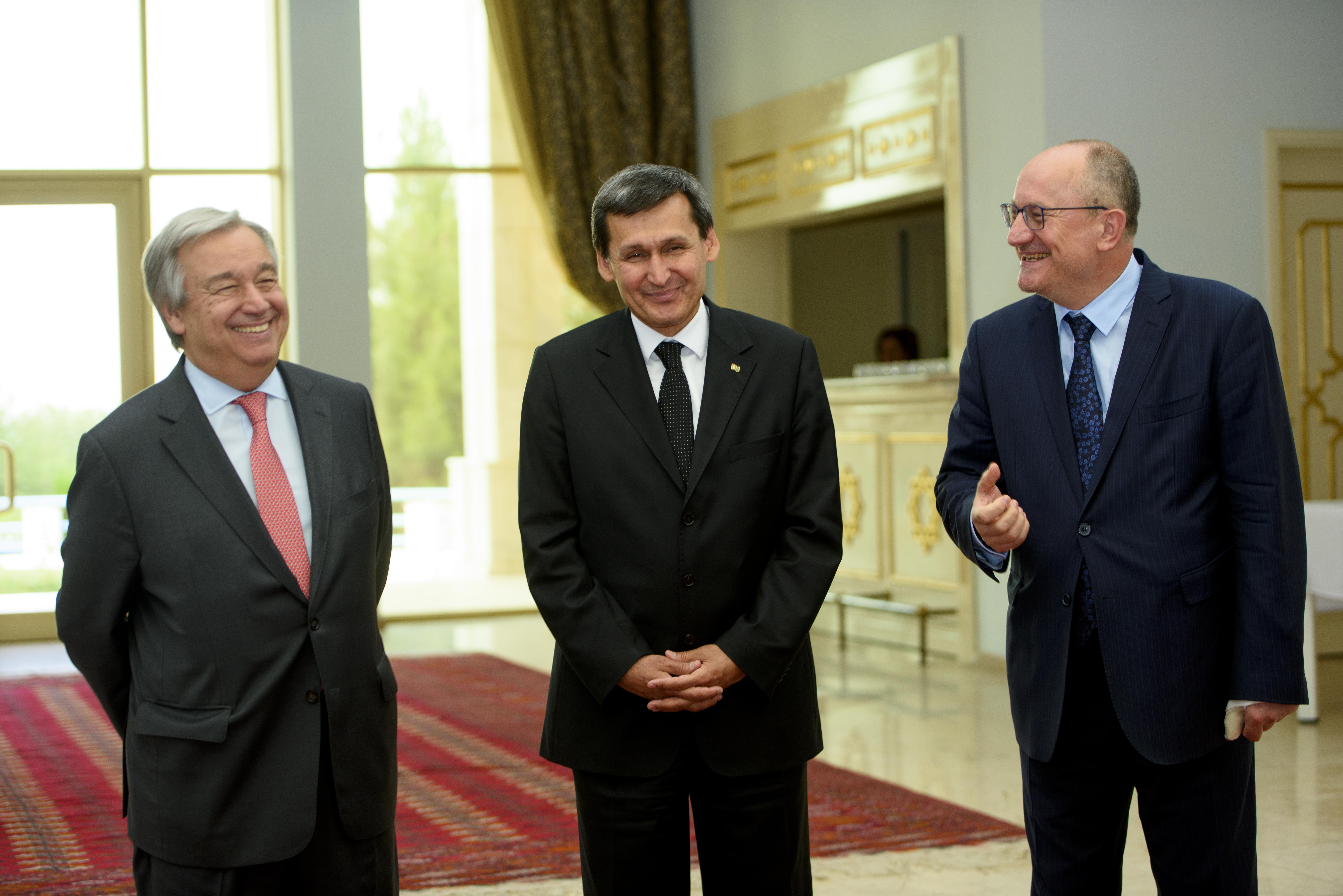 Ashgabat, 13 June 2017 – On Tuesday, United Nations Secretary-General Mr. Antonio Guterres, accompanied by Deputy Chairman of the Cabinet of Ministers and Minister of Foreign Affairs of Turkmenistan Mr. Rashid Meredov, Permanent Representative of Turkmenistan to the United Nations Aksoltan Atayeva and UN Resident Coordinator Elena Panova visited the United Nations Regional Centre for Preventive Diplomacy for Central Asia (UNRCCA).